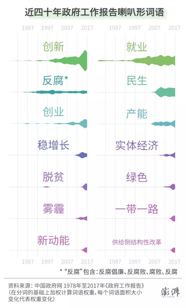 还有部分词语愈发频繁地出现在《政府工作报告》中。“创新”,1997年后开始被频频提起,因其增长趋势,澎湃新闻将此类词语称为“喇叭形词语”,类似的词语还有“就业”、“创业”、“民生”等。