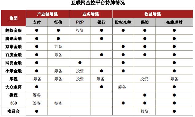 按平台主体和资本来源看,金控“巨无霸”主要有六大模式:包括央企产业集团、地方政府、民企和互联网企业四类的产融系金控平台,以及非银系和银行系两类金融机构为主的融融系。本报告梳理了六大类金控集团的牌照及业务方向。