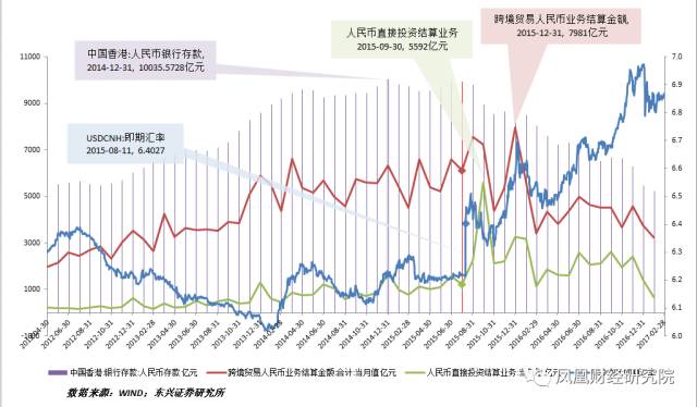 2014年之前,人民币长期存在单向升值预期,境外投资者热衷于持有人民币获得升值收益,人民币资金池迅速扩大。2014年底,香港人民币存款规模达到10036亿(约相当于上海的十分之一,超过新疆和海南人民币存款的总和)。