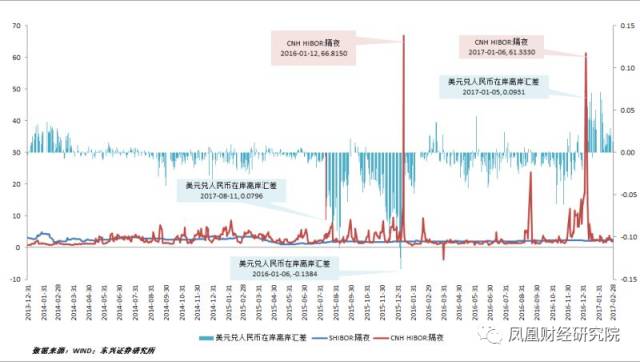 2016年1月和2017年1月,香港离岸人民币市场显然受到了强有力的干预。2016年1月12日,香港人民币隔夜拆解利率(CNH HIBOR)飙升至66.8%,2017年1月6日则飙升至61.3%。