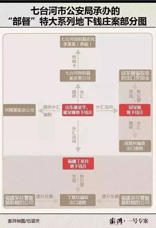 近日,七台河警方向澎湃新闻披露了这一由公安部挂牌督办的特大地下钱庄系列案:打掉地下钱庄8个、报关行14家,查处骗取出口退税、虚开增值税专用发票违法犯罪企业15家。目前已抓获嫌犯82人,移送审查起诉65人。