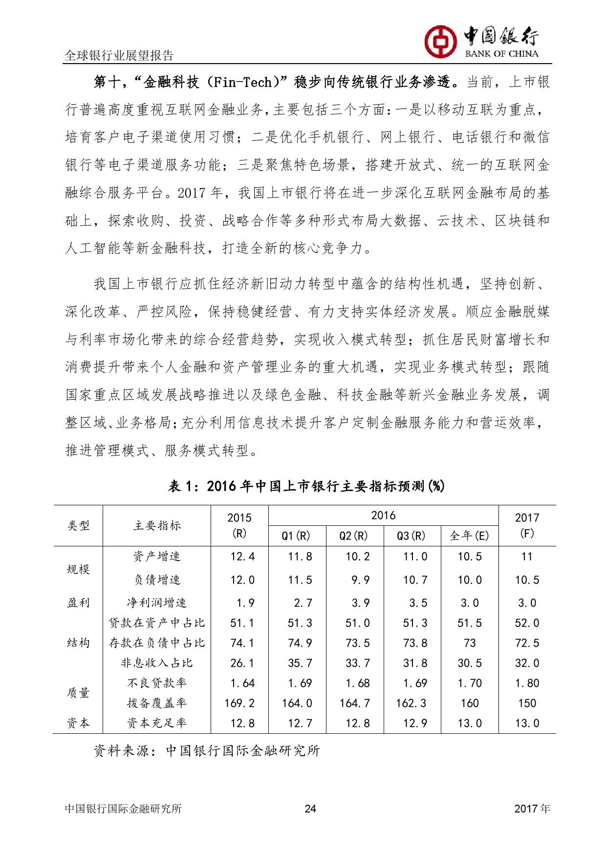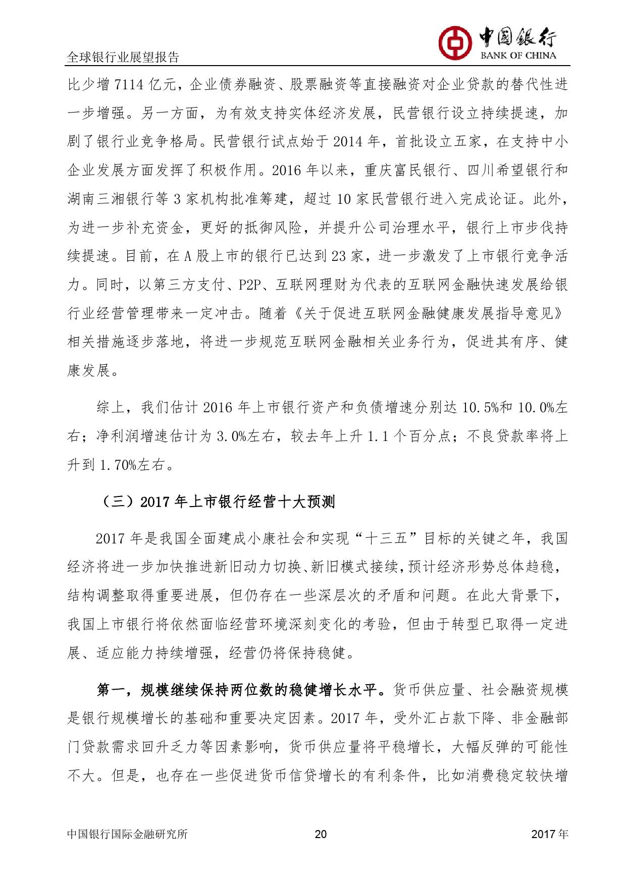 不过,中国银行预测,中国上市银行规模将保持两位数增长,预计非息业务收入贡献度将达30%,不良率上升势头放缓,零售银行业务发展有望迈入新阶段,“金融科技(Fin-Tech)”向传统银行业务渗透,国际化发展进入战略优化阶段,净利润增速将与今年基本持平,但息差业务仍面临挑战,成本收入比面临长期拐点,资本充足状况压力较大,稳健经营、保持可持续发展是银行提升竞争力的关键。