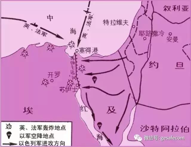 ▲1956年中东战争形势图:第二次中东战争,又称苏伊士运河战争,起因是英、法两国为夺得苏伊士运河的控制权,联合以色列于1956年10月29日对埃及发动的军事行动。三国的行动遭到国际社会的普遍指责,美、苏两国也介入其中,迫于各方压力,英、法两国于11月6日被迫停火,以色列随后也撤出西奈半岛。这场战争也标志着美国和苏联两个超级大国真正开始主宰中东乃至全世界的力量。
