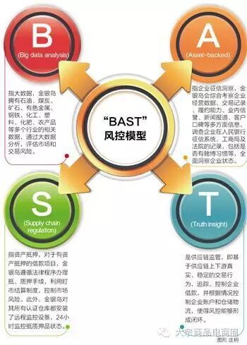 王宇宏:金银岛在产业链金融方面创造了BAST风控模型(见图)——对信息流、资金流、物流的全程掌控。基于这样的机制保证,与金银岛合作的企业在向银行贷款时,可以做到“秒杀”——纯线上贷款几秒钟即可到账。