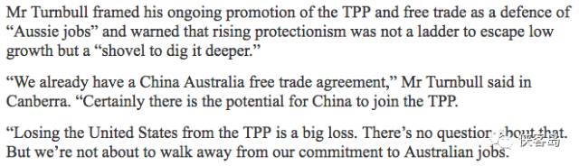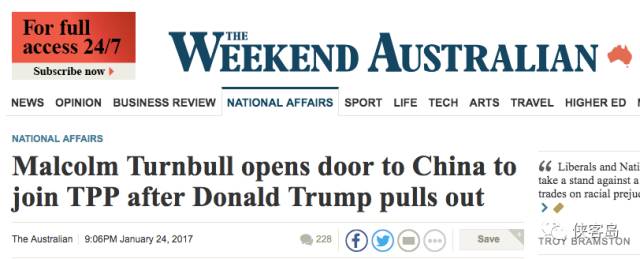 《澳大利亚人》报道澳总理欢迎中国加入TPP