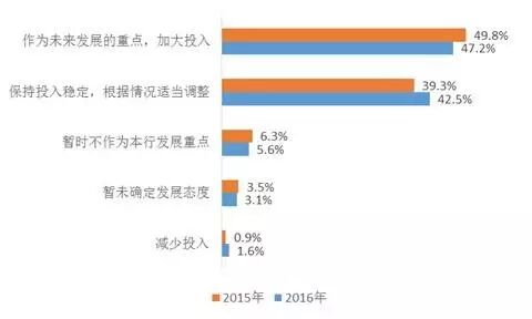 银行家重视发展互联网金融,调查结果显示,47.2%的银行家将互联网金融作为未来的发展重点将加大投入,占比最高;42.5%的银行家选择继续保持稳定的投入,上述两项的占比远高于选择不作为发展重点、暂不确定和减少投入的银行家占比。对比2016年与2015年的调查结果,选择互联网金融作为发展重点的银行家占比有所下降,而选择保持稳定投入的银行家占比有所上升,这可能与互联网金融发展由爆发式增长逐步转变为平稳发展、互联网金融领域风险暴露、银行家态度更加理性等因素相关。