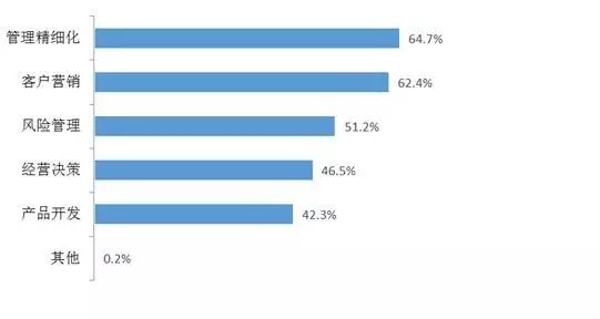 对于大数据技术的应用领域,调查结果显示,选择管理精细化、客户营销的银行家占比较高,分别为64.7%、62.4%,这一定程度上反映出银行家对于提升经营管理水平、加大业务拓展的重视程度。选择将大数据技术应用于经营决策(46.5%)、产品开发(42.3%)的银行家占比相对较低,这可能与经营战略制定、产品开发等更依赖于银行专业人员的经验,以及相关数据完备性不足等因素相关。