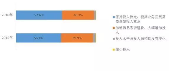 关于未来三年银行信息科技建设投入的调查结果显示,57.6%的银行家继续保持投入稳定,会根据业务发展需要调整投入重点;40.2%的银行家会加速信息系统建设,大幅增加投入。调查结果与2015年相比,选择上述两项的银行家占比均小幅上升;而选择保持信息科技建设投入水平与结构不变、减少投入的银行家占比均出现下降,反映出银行家对信息科技建设的重视程度不断增强。