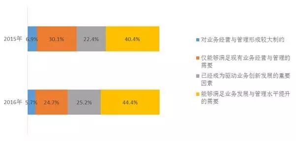 银行业信息化建设经过近年来的不断大力发展,在推动国内银行创新发展方面的成效日益显现,得到越来越多的银行家认可。调查结果显示,44.4%的银行家认为目前的信息化技术水平已经能够满足业务发展与管理水平,25.2%的银行家认为信息化技术的发展已经成为驱动业务创新发展的重要因素,上述两方面比2015年的调查结果分别上升了4.0个百分点、2.8个百分点。与此相对,认为信息技术“仅能够满足现有业务的经营与管理需要”的银行家占比下降了5.4个百分点。这一定程度上反映了大部分银行家对信息化建设成效的肯定。