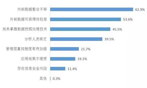 在对应用大数据技术过程中面临主要问题的调查中,62.9%的银行家认为现阶段大数据技术主要受限于内部数据整合不够,这可能与不同业务条线化管理以及数据结构设计未充分考虑大数据技术应用需求有关;此外,53.6%的银行家选择外部数据可获得性较差、45.5%的银行家选择尚未掌握数据挖掘处理技术。而选择管理层重视不够、应用成果不理想、存在信息安全风险的银行家占比仅分别为21.7%、19.1%、11.4%,在一定程度上反映了银行家对大数据技术的高度重视以及对其未来巨大应用潜力的期许。而对于信息安全风险则可以通过相应的安全技术予以解决,银行家已在风险与收益间取得适当平衡。