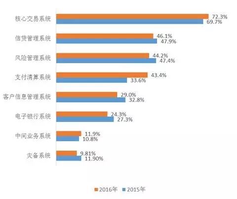 调查结果显示,对于不同细分类型的信息系统,银行家较为关注核心交易系统(72.3%)、信贷管理系统(46.1%)、风险管理系统(44.2%)及支付清算系统(43.4%)。对比2016年与2015年的调查结果,选择核心交易系统、支付清算系统的银行家占比均有所上升,这反映银行家对基础性、关键性信息系统的关注程度较高。