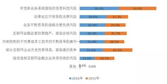 信息技术作为发展互联网金融的重要依托,具有根本性影响,相应在互联网金融的技术应用研发、运营管理等方面潜在的信息技术风险受到银行家的高度重视。关于互联网金融发展相关风险的调查结果显示,56.4%的银行家选择“开发新业务系统所面临的信息科技风险”,占比最高;其次是法律定位不明确导致的法律风险(38.6%)和业务不熟悉导致战略决策失误风险(36.9%)。对比2016年与2015年的调查结果,仅有选择“部分互联网企业先发优势明显,面临激烈竞争”(33.4%)、“违法违规互联网金融企业传导形成的风险”(21.6%)的银行家占比出现下降,而选择其他风险的银行家占比均有所上升。一方面银行家日益认识到互联网金融领域蕴含的风险,对业务发展中面临的风险更加重视并加强风险防范,降低风险传染的可能;另一方面大量互联网金融企业出现问题,降低了对银行业务的竞争压力。