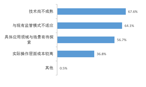 目前虽然众多金融机构重视并开展了区块链技术与金融领域深入融合的研究,但尚未出现超越或类似比特币的广泛应用领域。调查结果显示,多数银行家认为区块链在商业银行中的应用还存在着很多障碍,前景尚有待观察。 67.6%的银行家认为区块链技术在商业银行中的应用还不是很成熟,64.1%的银行家认为,区块链技术与我国现有的监管模式不是很适应。此外,56.7%的银行家认为具体的应用领域及场景有待探索,36.8%认为实际操作层面的成本较高。