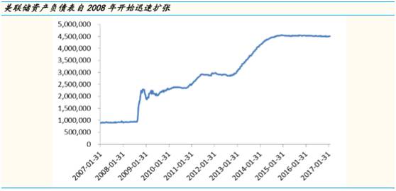 2008年11月到2014年10月期间,美联储通过三轮QE,累计买入2.1万亿美元抵押贷款证券(MBS)、1.7万亿美元国债和2000亿美元机构债,资产负债表规模从不到1万亿美元迅速膨胀至创纪录的4.5万亿美元。在2014年结束QE后,美联储继续对持有到期的证券进行同等规模的再投资,因而资产负债表规模一直没有改变。