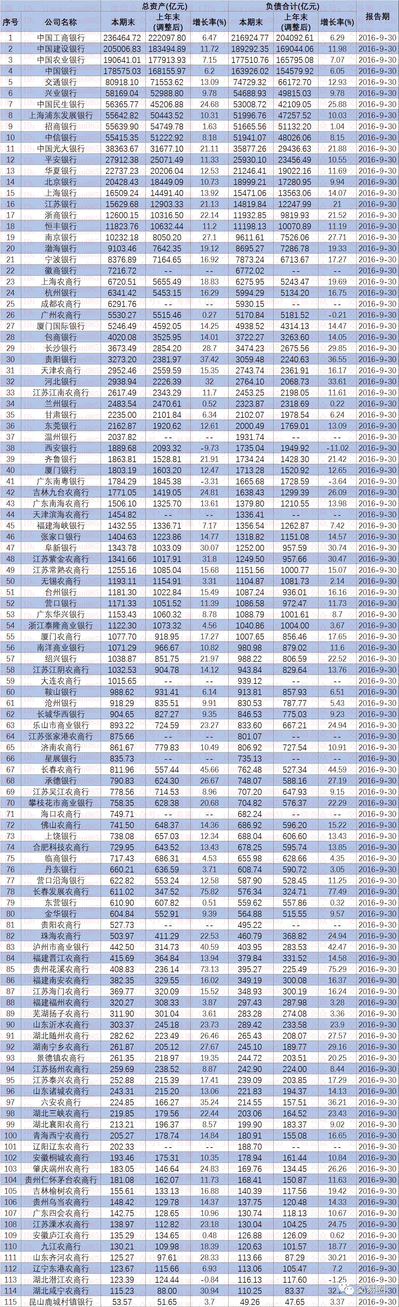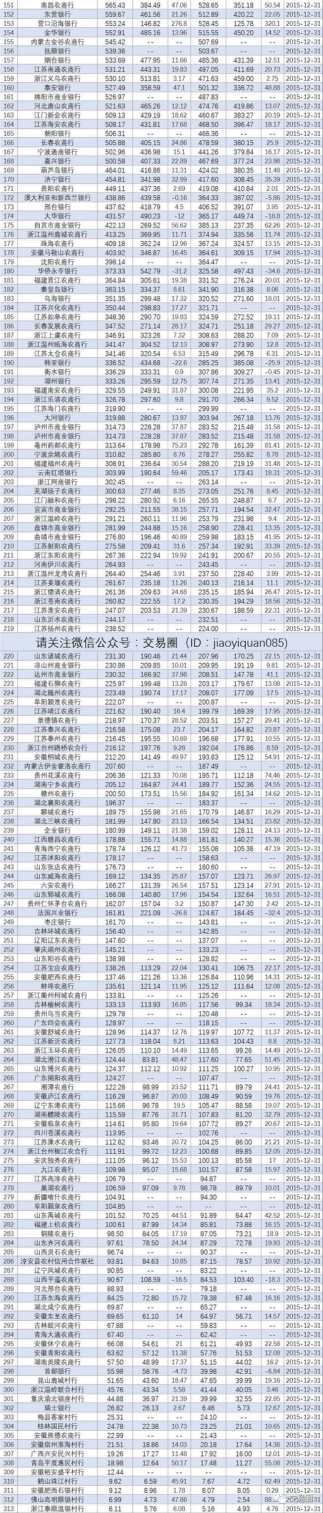 2016年300多家银行资产规模排名