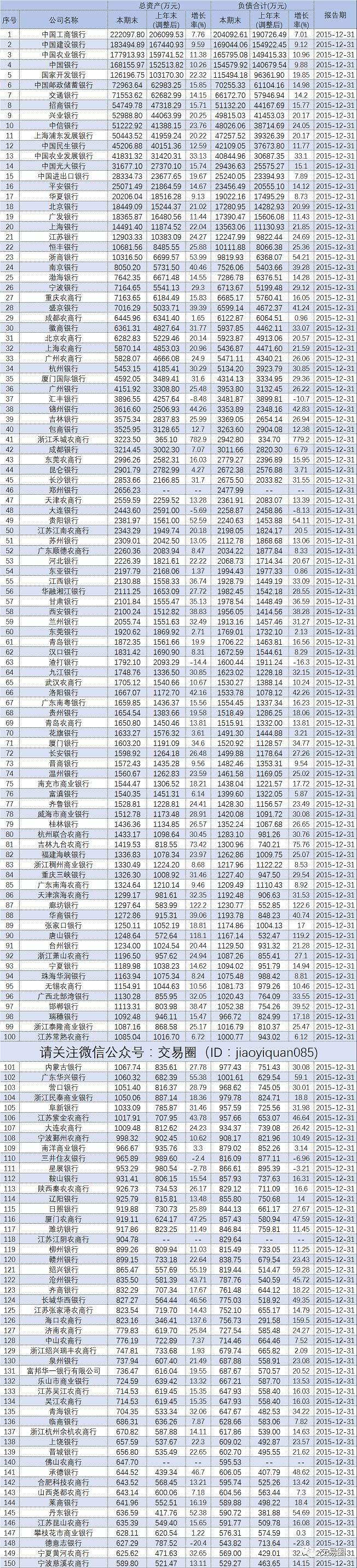 2015年银行资产规模排名情况