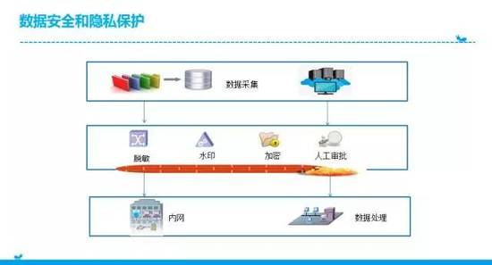 在大数据时代如何保护客户隐私和数据安全,我用这个图来讲一下,大家可以看到这是我们内部的流程。数据采集过以后,任何人在使用以前必须经过脱敏,即隐藏身份;加上水印,这样如果数据泄露可以知道是哪一个环节出了问题;之后对数据进行加密,如果使用大量的数据还要要通过人工审核。
