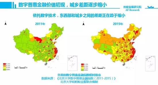 下面这张图是黄益平老师的数字金融研究中心做的一些研究,可以看到从2011年到2015年,普惠金融的城乡差距在迅速缩小,越是落后的地方发展的越快,因为越落后的地方需求更迫切,而技术让这种需求的满足成为可能。