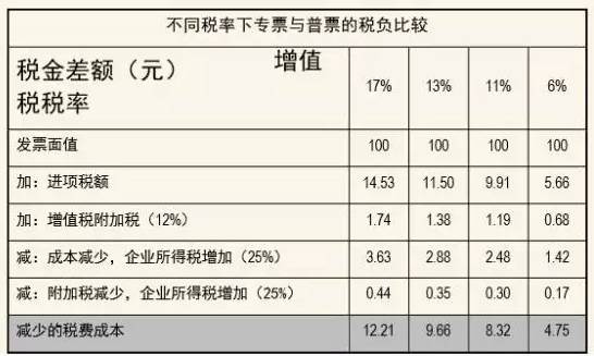 通过表1可以看出,在一般纳税人企业,不论增值税税率多少,取得增值税专用发票比取得普通发票,都能减少企业的税费成本。
