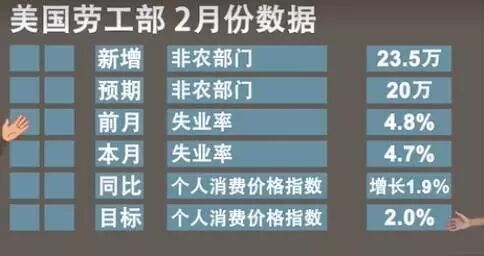 2月份美国非农部门新增就业岗位23.5万个,远高于维持失业率不变所需的7.5万至15万个的水平;并预计到今年年底美国失业率将由当前的4.7%下降为4.5%,在2019年会继续维持这一水准。