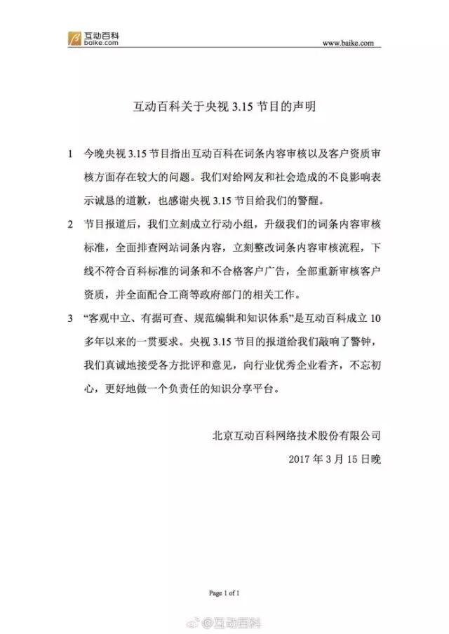 互动百科表示,为此造成的不良影响表示诚恳道歉,全面排查词条内容,立刻整改词条内容审核流程,下线不符合百科标准的词条和不合格客户广告,全部重新审核客户资质。