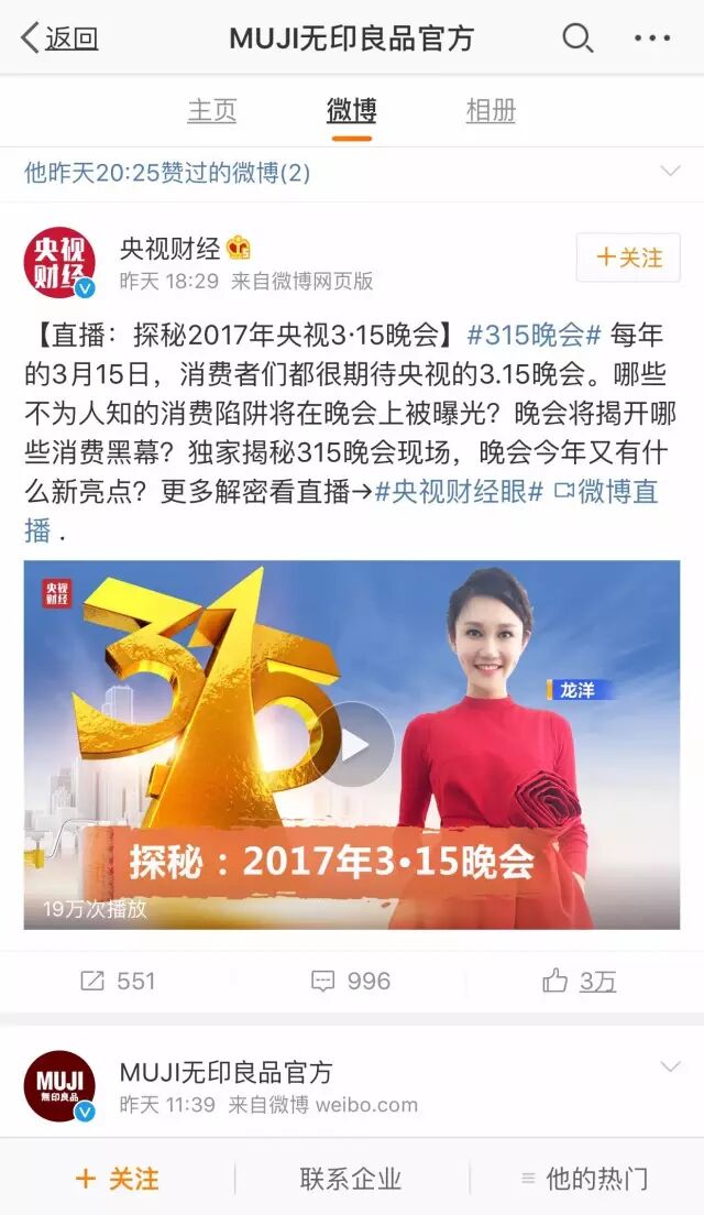 昨晚,无印良品方面一直保持沉默,其官方微博在20时25分还在为“3·15”晚会点赞……