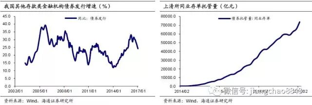 从结构上来看,银行主动负债行为近几年在急剧增加。银行负债中,最大的一块是存款,而存款属于银行的被动负债,这一块银行自身是很难控制的。尤其对于中小型银行来说,由于网点和信誉的限制,吸收普通存款的能力有限,再加上近几年银行存款“搬家”导致“蛋糕”愈来愈小,要支持资产规模扩张,银行必须增加主动负债。如果用银行总资产除以存款与实收资本之和来估算银行主动负债程度,结果发现从12年开始这一比例就在大幅攀升,从不足1.4的水平升至当前的1.5以上,尤其是近两年攀升速度在加快。监管较松的部分同业业务、表内外理财业务为银行打开了一扇大门,成为银行主动负债的重要途径。