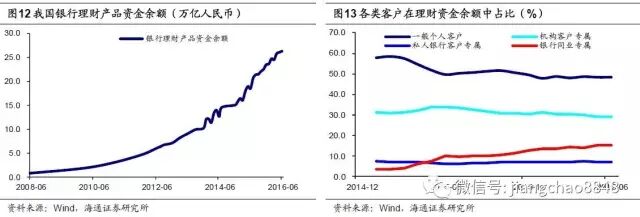 14年以来,理财表现出的一大新特点是同业理财急速飙升。与同业存单飙升的逻辑很类似,中小银行为了扩大规模,成为同业理财的发行主力。银行同业理财占总理财资金的比重在2015年初时不足4%,而截至2016年年中这一比例已经达到了15.3%,规模净增加了3.5万亿。