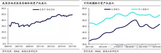 本轮中小型银行扩张速度要快于大型银行。小型银行的总资产增速从15年初的20%上升至16年的接近30%,中型银行从15%上升至近20%,而大型银行本身资产规模就较大、扩张空间有限,增速从8.5%微升至11.7%。所以本轮资产扩张比较迅猛的依然是中小型银行。