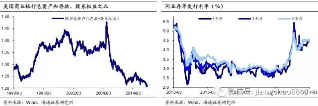 金融体系的风险在增加。如果扣除存款以后,增加的杠杆往往是金融泡沫的体现,因为如果银行体系的资金流入了实体经济,最终又会以存款的形式回流到银行系统,而如果银行的资金只在金融体系中打转往往形成泡沫。美国在互联网泡沫和08年金融危机爆发前,均经历了银行业杠杆率大幅上升的过程。中国银行业杠杆率的飙升,也孕育着较大的风险。从负债端来看,当前银行同业存单发行利率从去年低点时的不足3%,已经上行到了4.4%以上,资金成本在上升。而从资产端来看,债市震荡,经济下行压力增加贷款和非标风险,资产和负债息差收窄将对银行、尤其是中小银行盈利构成巨大的威胁。