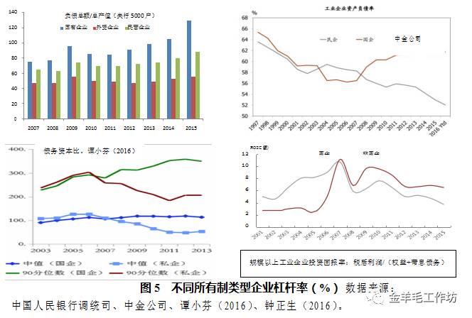 Mecklin(1976)等学者考虑到债务会导致企业财务破产的情形,对 MM 定理进 行了修正。如果公司偿债困难将陷入财务困境甚至破产。公司进行融资决策时, 就会在债务节税收益与财务困境成本间进行权衡。显然,企业财务约束越严格, 负债动机越弱。相反,预算软约束则降低了企业财务约束和破产可能,增大了企 业主动负债动机。我国存在大量预算软约束的国有企业,或是大而不倒的房地产 企业,其杠杆率较同类企业明显更高4,加之刚性兑付及破产清算成本过高等问 题,进一步刺激了过度负债。图 5 列示的各口径统计数据表明,我国非金融企业 债务结构上的一个显著特点,就是国有企业负债率明显高于民营企业。如果同时 结合资产收益率看,则正好相反——非国企明显高于国有企业。这一对比表明, 2008 年以来,我国加杠杆主要加在了资产收益率不断下降的国有企业身上,由 此亦可解释为何宏观和微观杠杆率出现背离,这一角度可进一步深化前述周期视 角所作的解释,即 2009 年以来我国宏观杠杆率之所以加快上升,在经济周期上, 主要表现为增长放缓阶段的延长,即经济走势呈 L 型而非 U 型更非 V 型;而经 济周期放缓阶段延长的背后,则是债务配置(资金投向)和投资回报一定程度上 的结构错配。