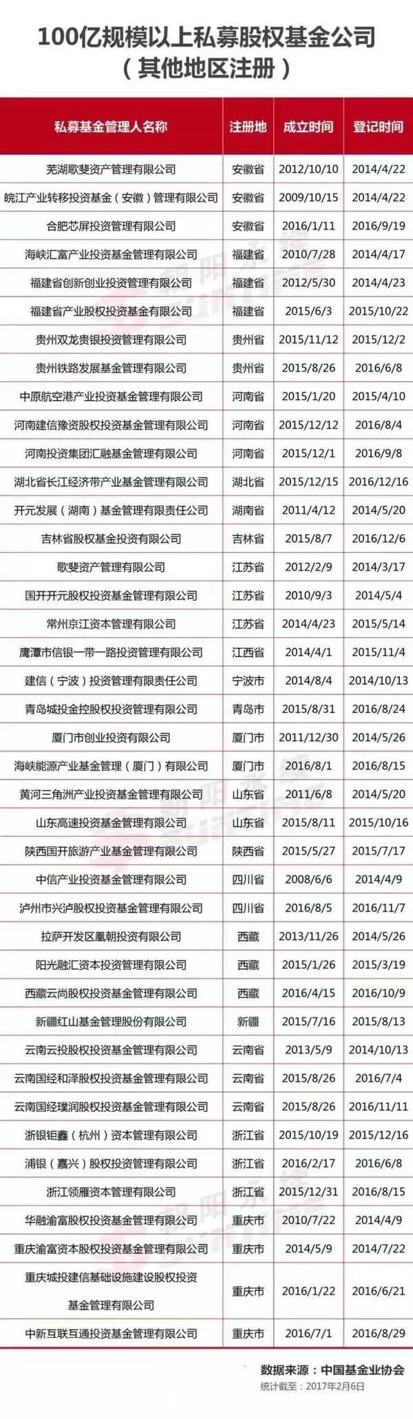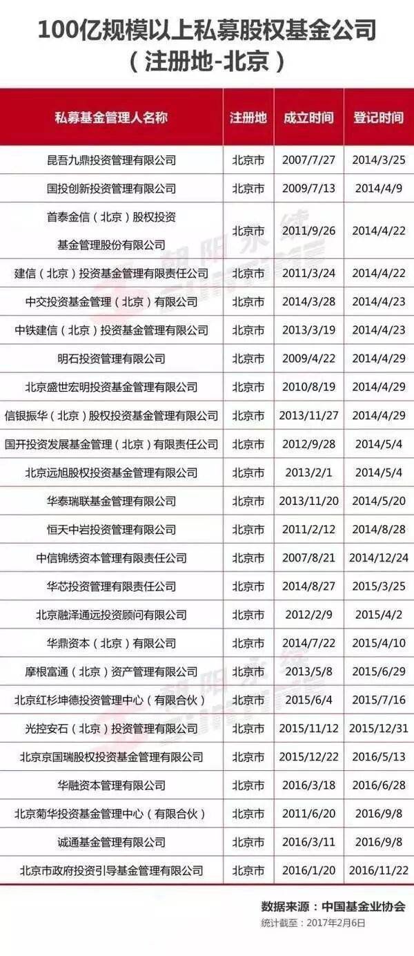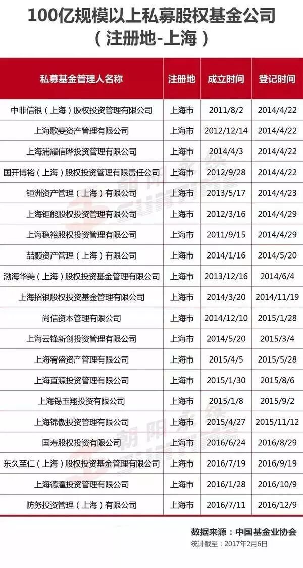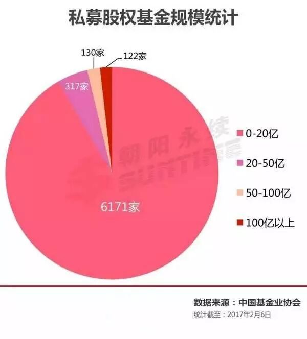 作者:Vallen Wu 来源:朝阳永续据统计,截止到2017年2月6日,中国基金业协会官网最新数据显示,目前共有6740家私募股权基金。其中100亿以上的有122家,