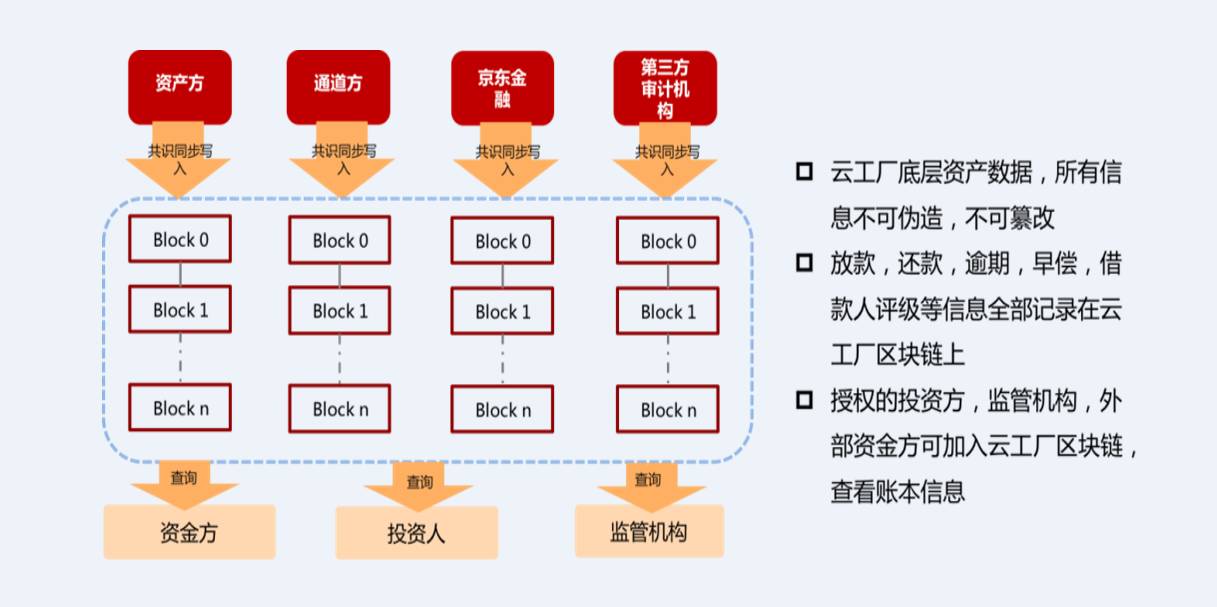 京东金融的资产云工厂业务实现了区块链资产管理系统的部署,系统设置了三个验证节点,底层资产池中每笔贷款的申请、审批、放款等资金流转都将通过区块链由各个验证节点共识完成。