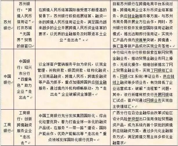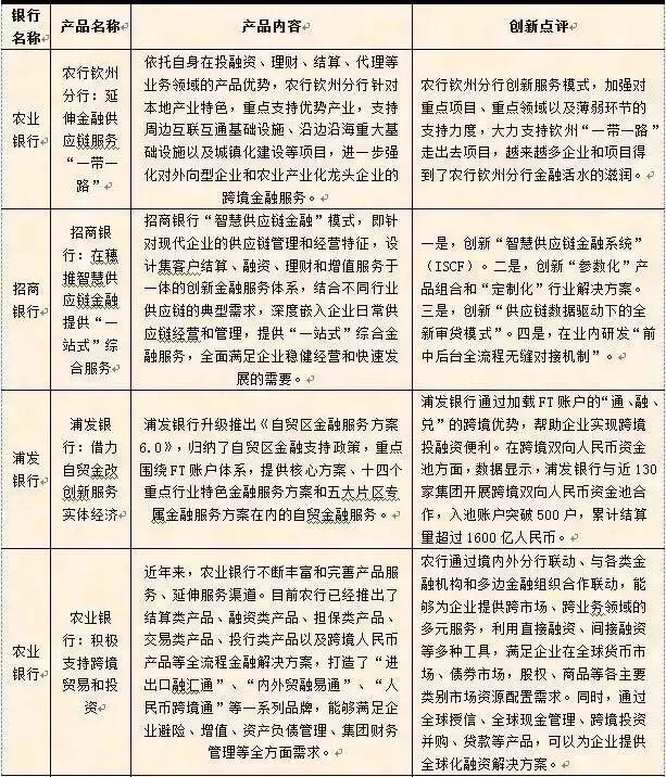 在近年来,农行钦州分行延伸金融供应链服务“一带一路”,招商银行在穗推智慧供应链金融提供“一站式”综合服务,工商银行创新跨境融资服务企业“走出去”等等。