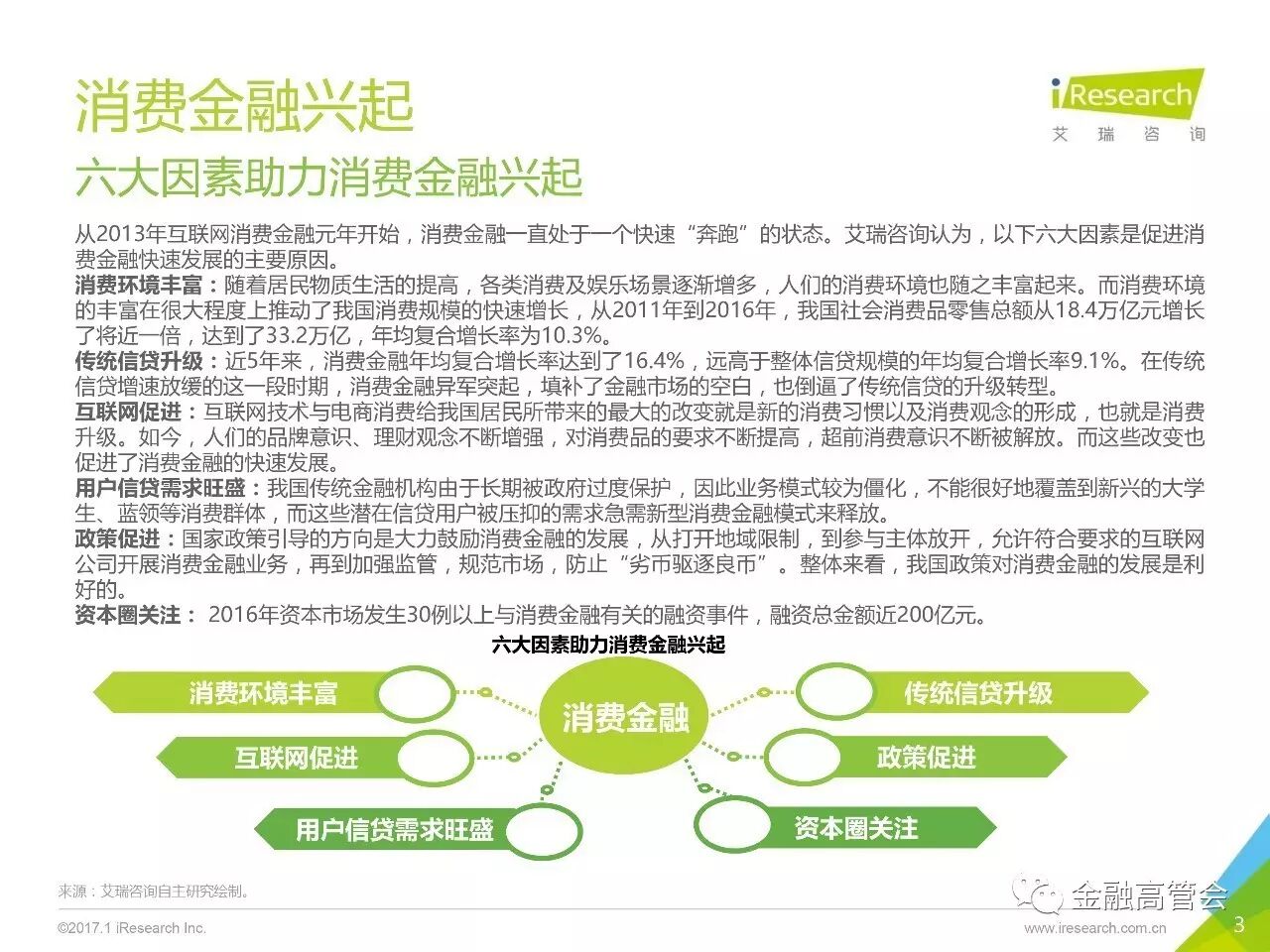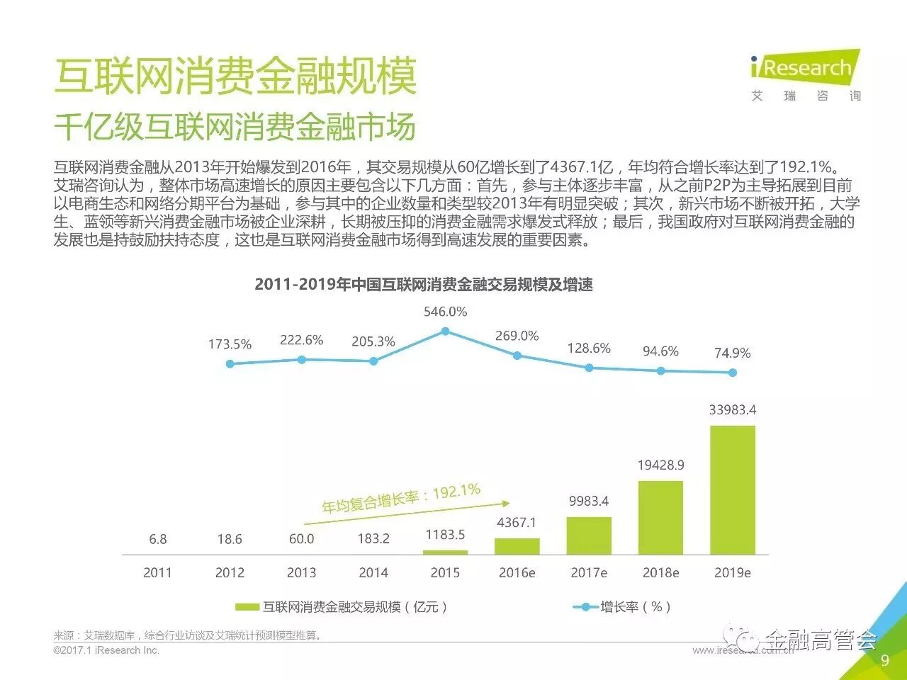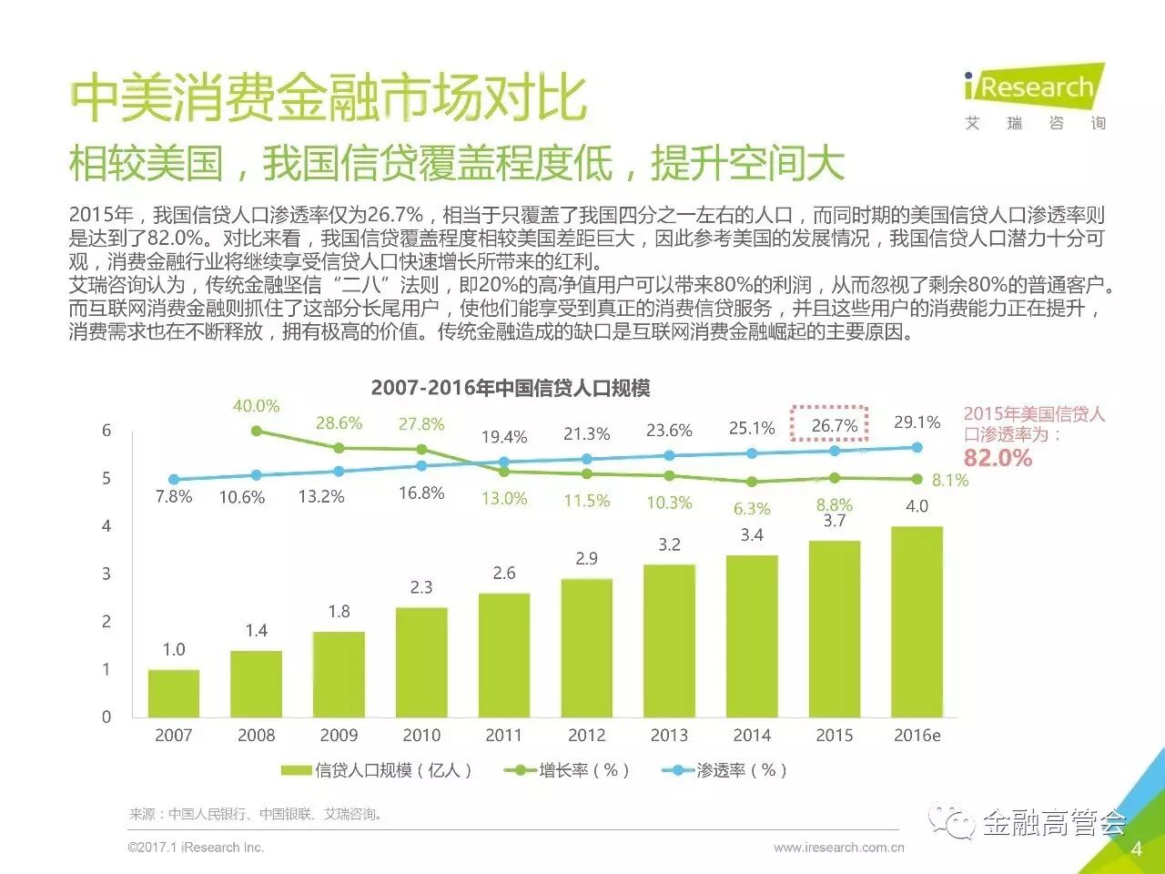 来源:艾瑞咨询2016 年中国消费信贷规模突破了22万亿互联网消费金融从2013年到2016年交易规模从 60亿增长到4367.1 亿年均复合增长率达到了192.1%”温馨提