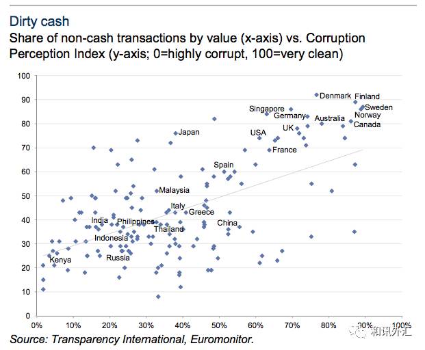 在一项高盛的研究中,无现金的程度(横坐标)与腐败程度(纵坐标)有着明显的相关性。
