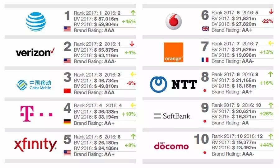 英国品牌评估机构Brand Finance发布“2017全球500个最有价值的电信品牌榜”(The most valuable telecoms brands of 2017)。美国电信公司AT&T以870.16亿美元名列榜首,美国威瑞森电信和中国移动名列第二、三位。