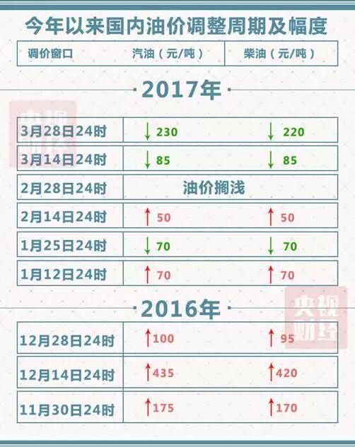 3月28日24时,2017年第6次成品油调价窗口将再次开启。本轮调价周期内,美国原油库存、产量双升态势打压市场,国际油价大幅下降。受此影响,国内成品油价格应声下调。记者刚刚从国家发改委获悉,此次油价调整具体为:汽油每吨将下调230元,柴油每吨将下调220元,创下年内最大降幅。