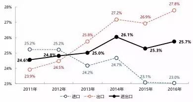 民营企业出口额占比始终保持最高且逐年上升,由2011年的46.6%上升至2016年的58.9%;外商投资企业、国有企业在出口总额中的占比均呈逐年下降的趋势,外资企业由35.4%下降至27.8%,国有企业由17.9%下降至13.1%。