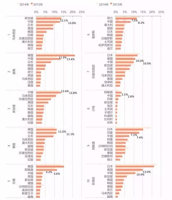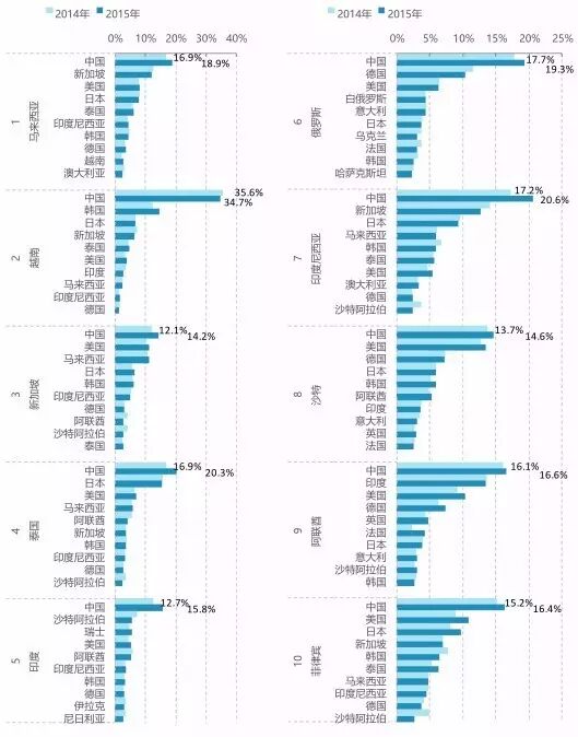 图6. 2014-2015年中国沿线前10大贸易伙伴的主要进口来源国