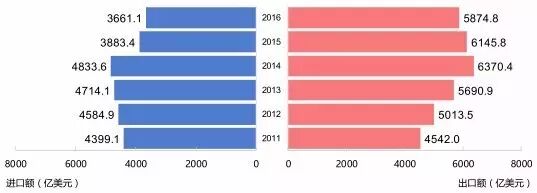 图4. 2011-2016年中国与“一带一路”沿线国家出口额和进口额