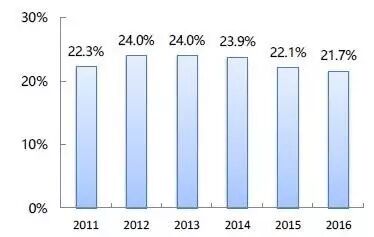图3. 2011-2016年中国与“一带一路”沿线国家贸易额占中国与全球贸易额比重