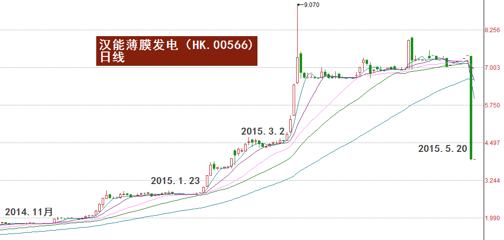 谁料半年之后,2015年5月20日,这个甜蜜的日子却成为许多持有汉能薄膜发电的投资者永生难忘的受难日。当天该股在早市开盘75分钟后突遭血洗式下跌,从开盘7.35元最低跌至3.88元,跌幅达47%。随后汉能紧急停牌,半小时内市值蒸发1400多亿元。