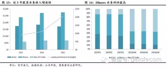 2013-2015年,股票的业绩收入上升明显,由9100万美元升至2.05亿美元。主动管理组合收入较为稳定,略有下降;iShares(股票ETF)组合收益逐年上升,且收入占比最高,约占50%;非ETF指数型组合收入稳定,占比约为10%,但其AUM超过50%。公司的iShares是公司的明星业务,体量大,且管理费低,相较于非ETF指数型基金有较多的优势。