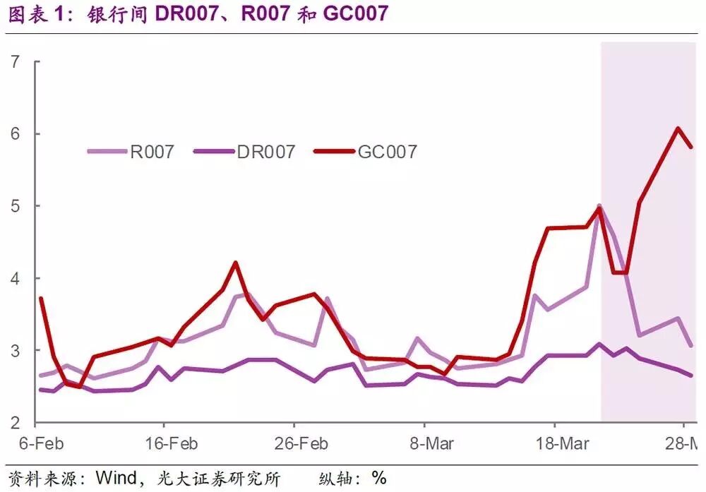 其结果是交易所待回购债券余额明显上升,而银行间余额却“意外地”出现了下降。交易所资金供需关系的变化导致了资金利率的上行,GC007的加权从3月21日的4.97%上升至3月29日的5.73%。