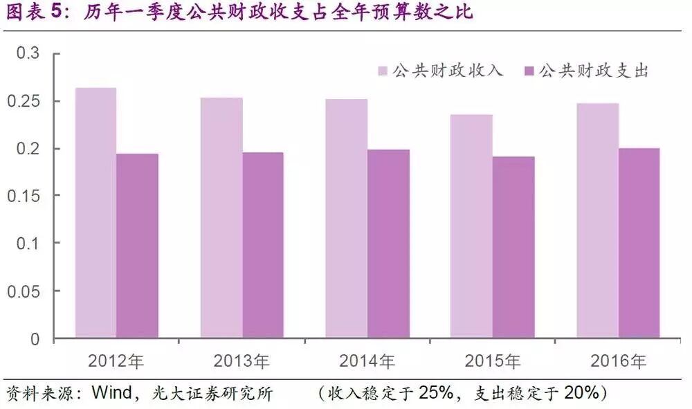 根据历史经验,历年一季度的公共预算收入占全年预算数的25%,公共预算支出占全年预算数的20%。今年公共预算收支的预算数分别为16.86万亿元和19.49万亿元,根据上述进度则一季度需要完成4.22万亿元和3.90万亿元,3月份需要完成1.07万亿元和1.41万亿元,3月的收支差为3400亿元。