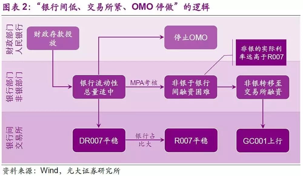 这些现象看起来似乎互相矛盾:虽然交易所利率高但是银行间利率低,虽然银行间利率低但是非银感到资金紧,虽然资金紧但是OMO连续停做。