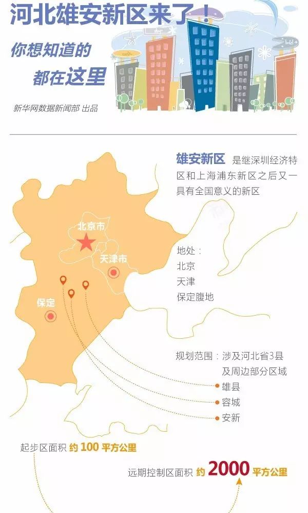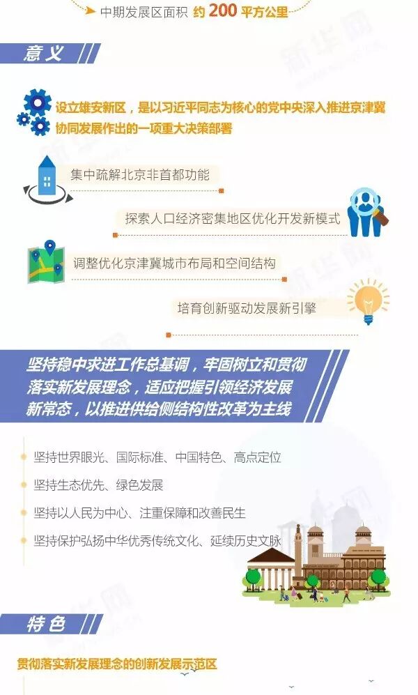 雄安新区规划范围涉及河北省雄县、容城、安新3县及周边部分区域,地处北京、天津、保定腹地,区位优势明显、交通便捷通畅、生态环境优良、资源环境承载能力较强,现有开发程度较低,发展空间充裕,具备高起点高标准开发建设的基本条件。雄安新区规划建设以特定区域为起步区先行开发,起步区面积约100平方公里,中期发展区面积约200平方公里,远期控制区面积约2000平方公里。