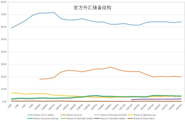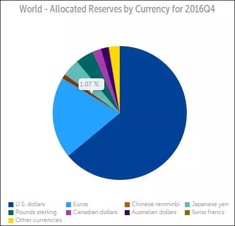 2016年第三季度 中国占参与官方外储构成报告成员外储资产的1.07% 来源:IMF