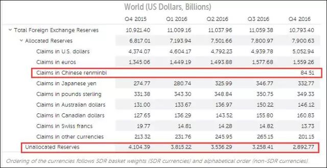 北京时间2017年3月31日晚间9点,国际货币基金组织(IMF)在官网上更新了“官方外汇储备货币构成”数据库(简称COFER)。该数据库历史上第一次将人民币计价储备持有情况,单独列项计算。